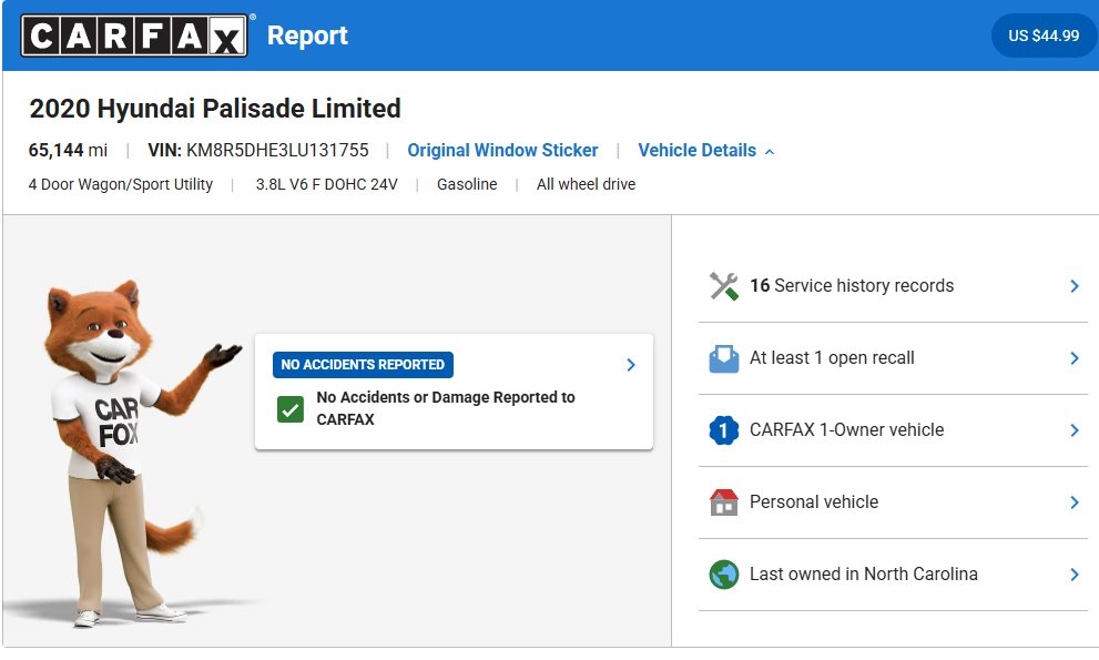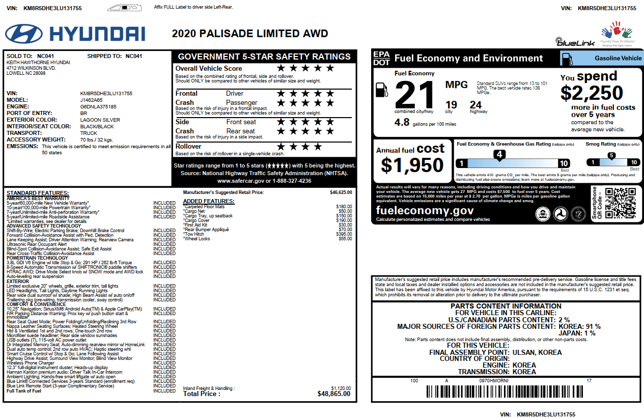 Expand View-more 2020 Hyundai Palisade Limited AWD see more $27,995 internet price Mileage: 65,218 Engine: 3.8L V6 DOHC 24V Transmission: Automatic Interior color: Black Exterior color: Lagoon Silver Fuel type: Gasoline VIN: KM8R5DHE3LU131755 Doors: 4 Door Stock number: 2626 Fuel economy: 19/24 Email Us From: Your message: Hello, my name is and I'm writing you today to learn more about the 2020 Hyundai Palisade Limited AWD listed for $27,995.00. I live in the area and I would like to hear back from you soon and learn more about this vehicle. Please call me at at your earliest convenience. Send Email Vehicle Description What is my Monthly Payment ? Vehicle Description What is my Monthly Payment ? What is my monthly payment? Price Down Payment Interest Rate (%) Term (months) 12 24 36 48 60 72 / month CALCULATE *Calculation is an estimation and doesn't include taxes and fees. 2020 Hyundai Palisade Limited AWD
